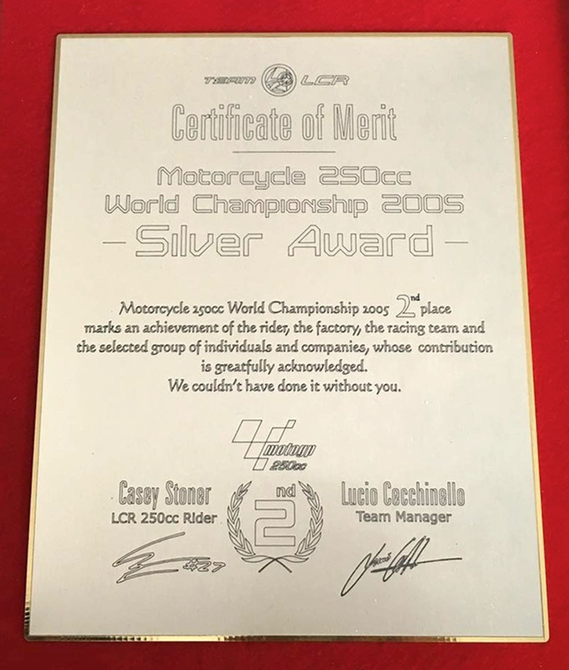 Certificato di Merito Campionato del Mondo di Motociclismo 2005 Premio d'Argento Il secondo posto nel Campionato del Mondo di Motociclismo 2005 segna una conquista dei piloti, la fabbrica, la squadra corse e il gruppo selezionato di persone e aziende, il cui contributo è sentitamente riconosciuto. Casey Stoner Pilota LCR 250cc Lucio Cecchinello Team Manager |